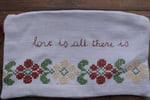 # 2 La borsa presenta su manico il ricamo "Love is all there is", frammento di una poesia di Emily Dickinson.