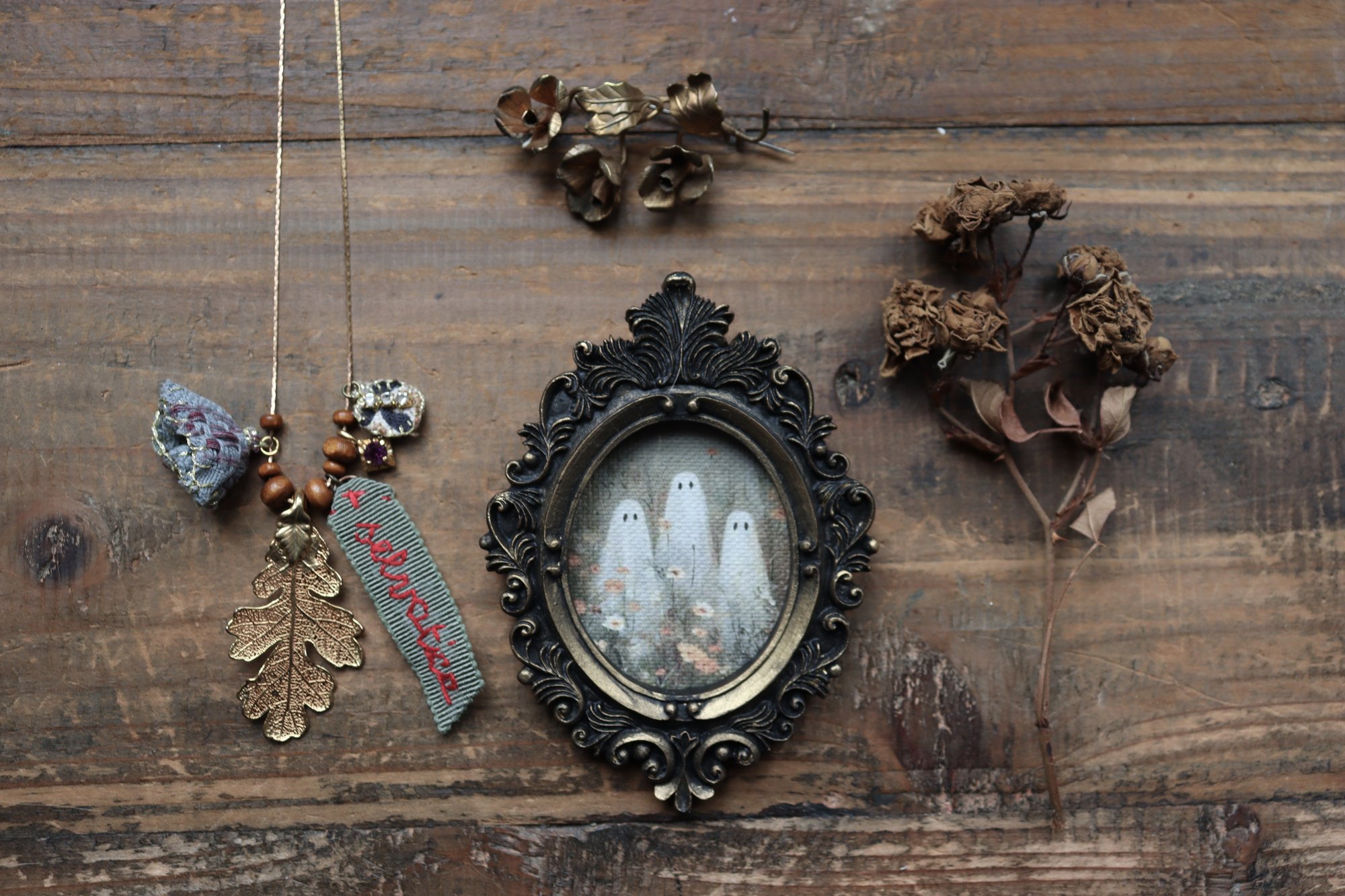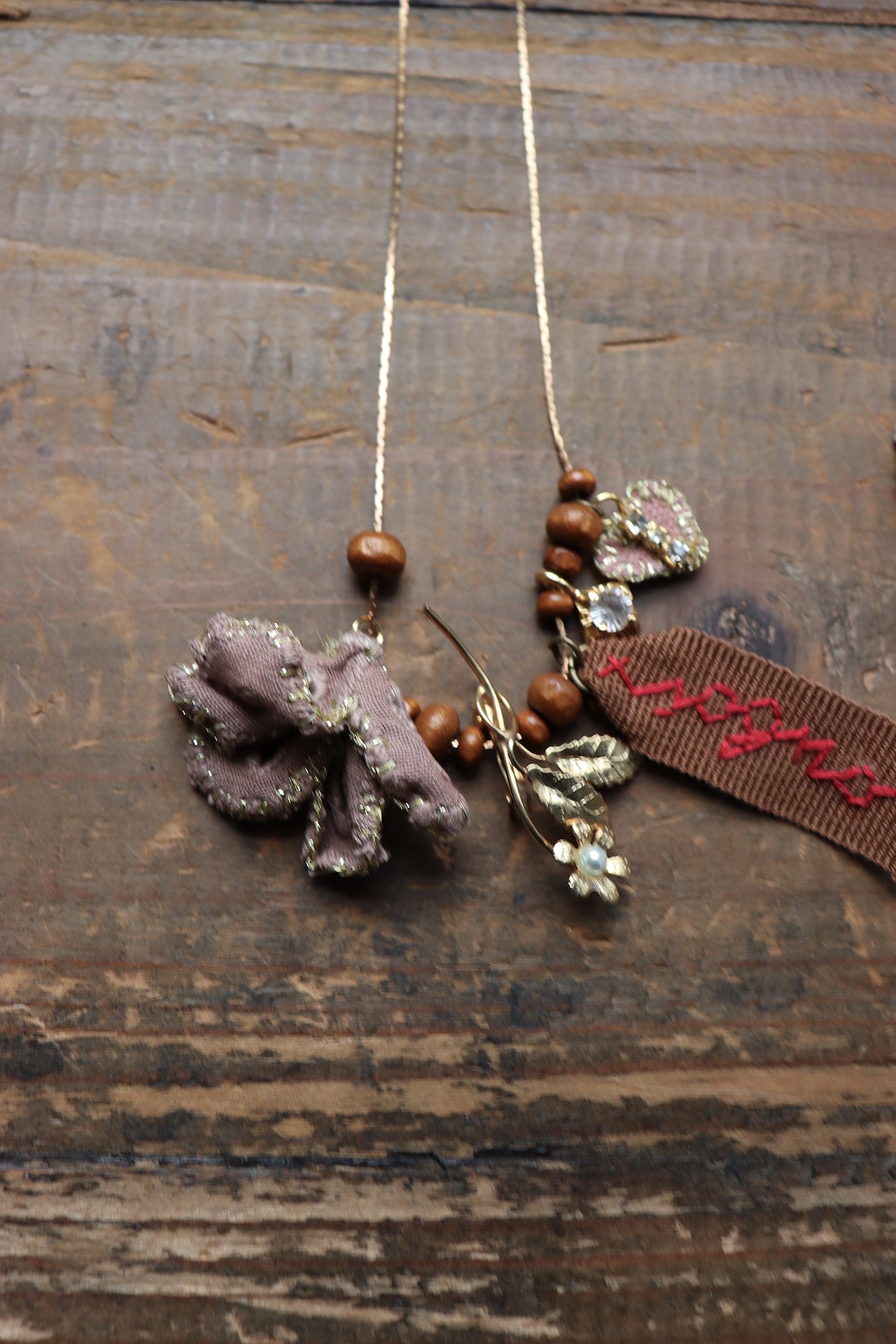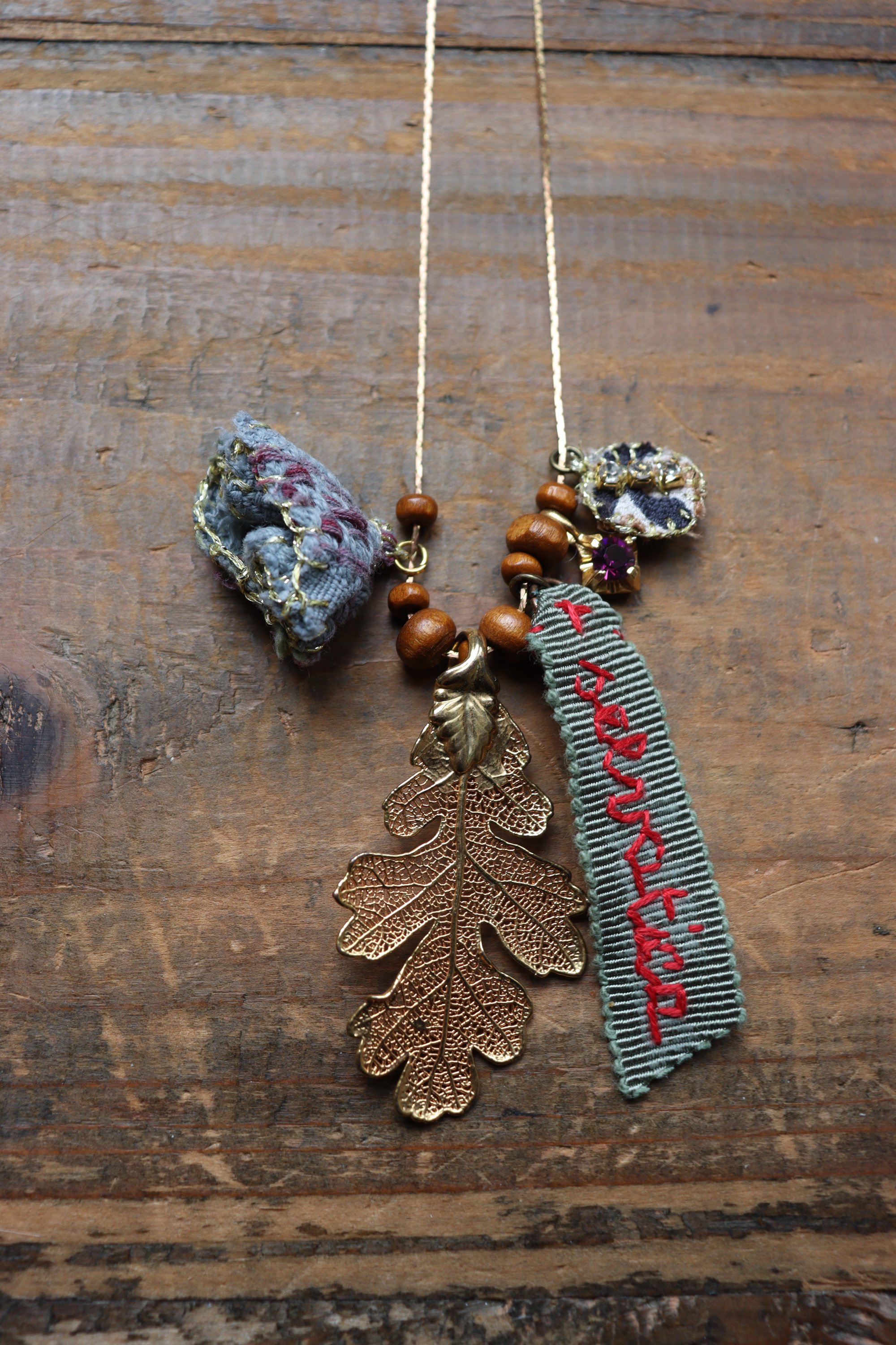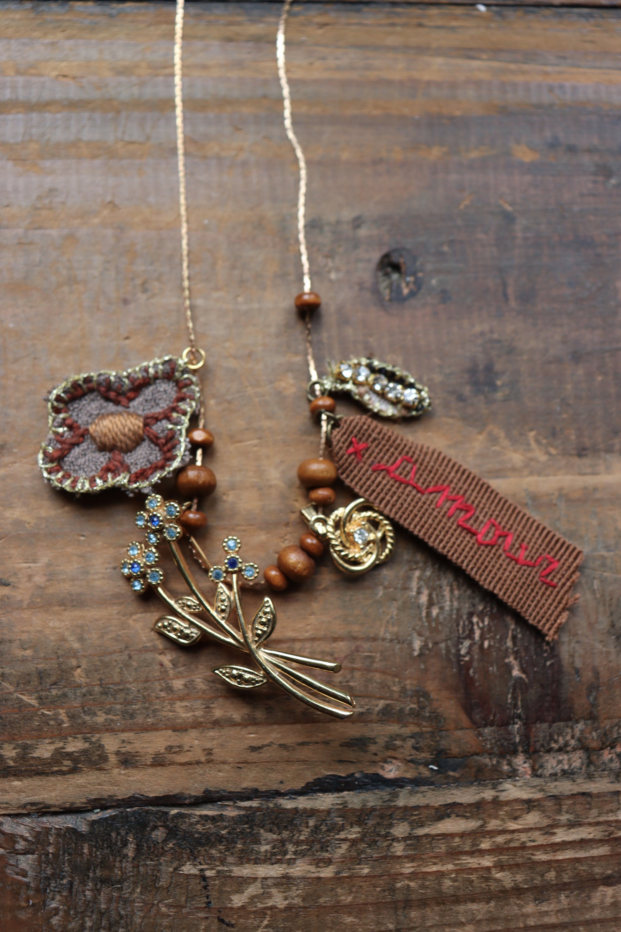 Collana con ciondoli vintage e ornamenti tessili ricamati a mano.