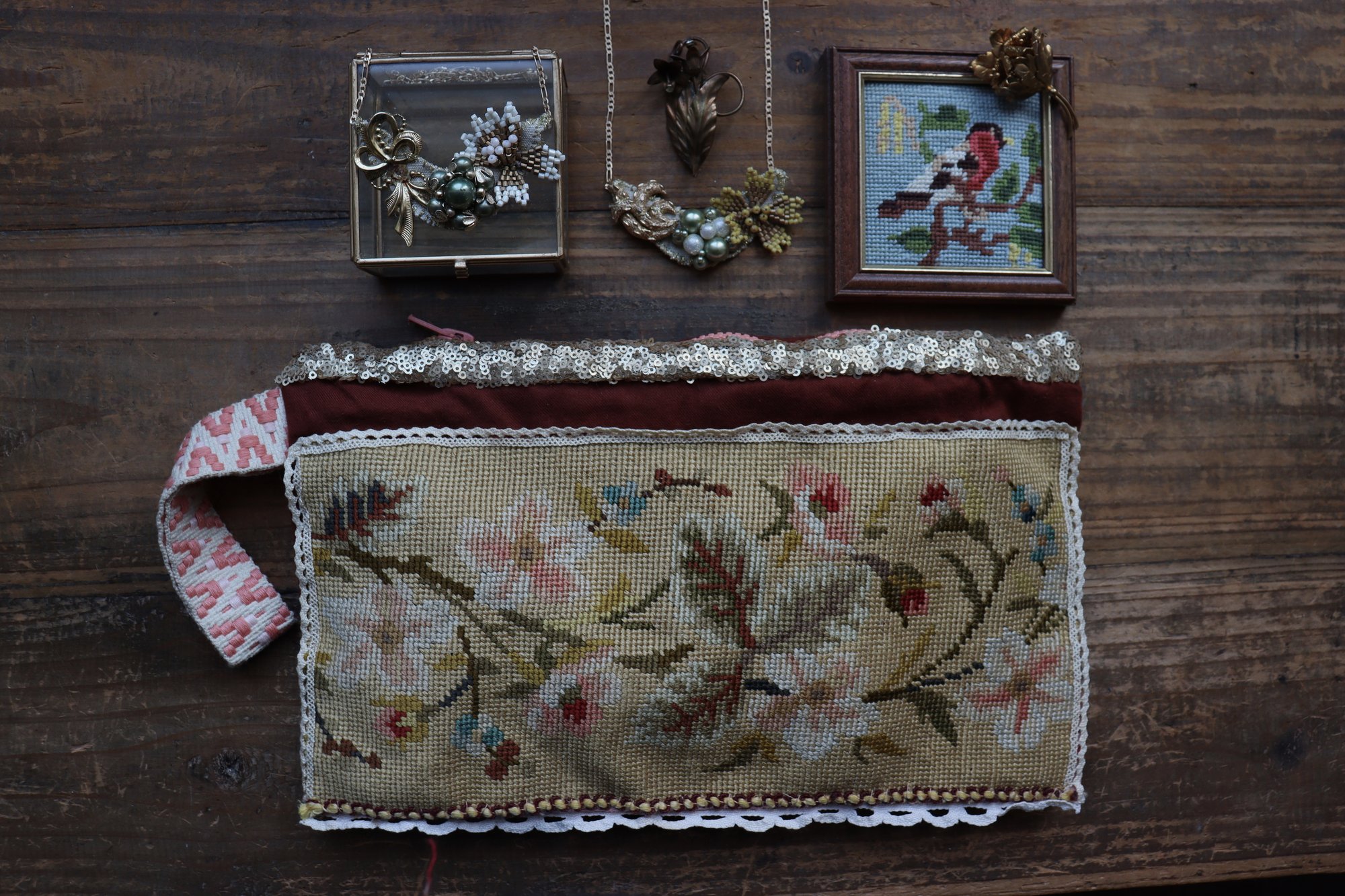 Pochette e collier realizzati con tessuti ricamati a mezzo punto e gioielli vintage.