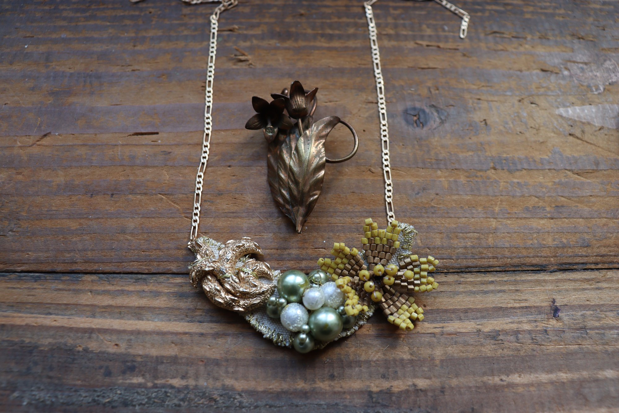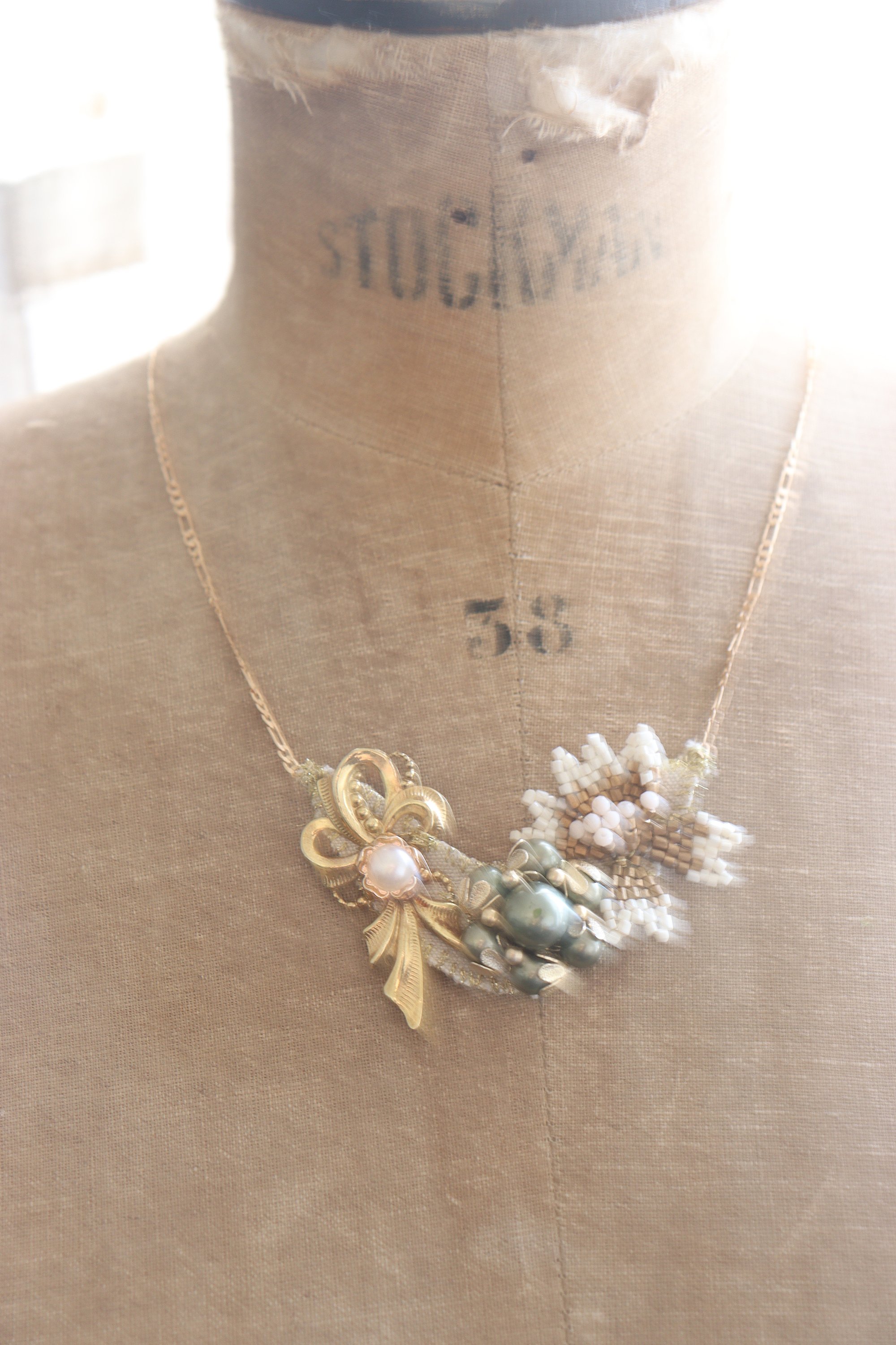 Collier: in lino antico con gioielli vintage applicati e fiore in perline.