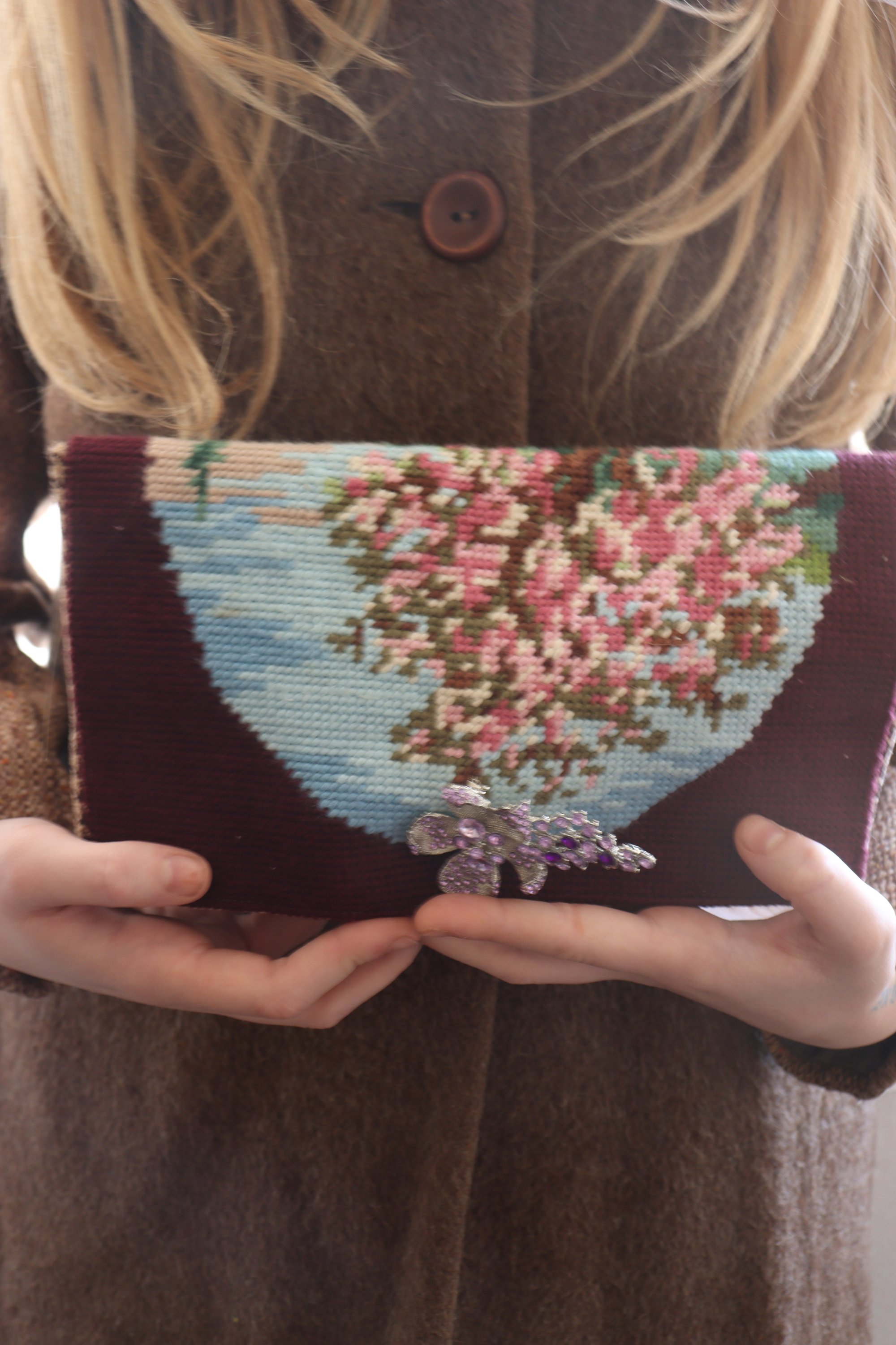 Pochette e collier realizzati con tessuti ricamati a mezzo punto e gioielli vintage.