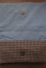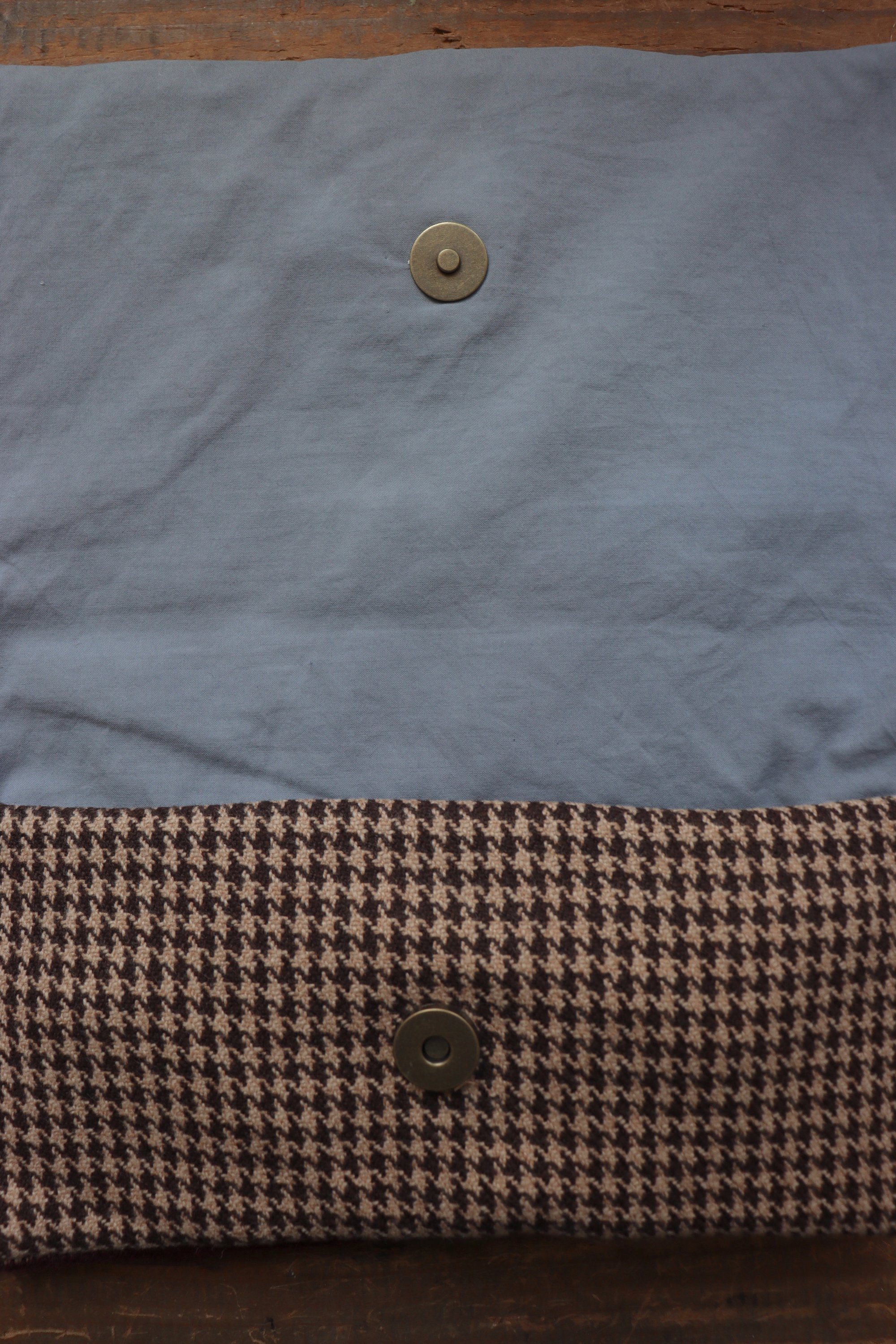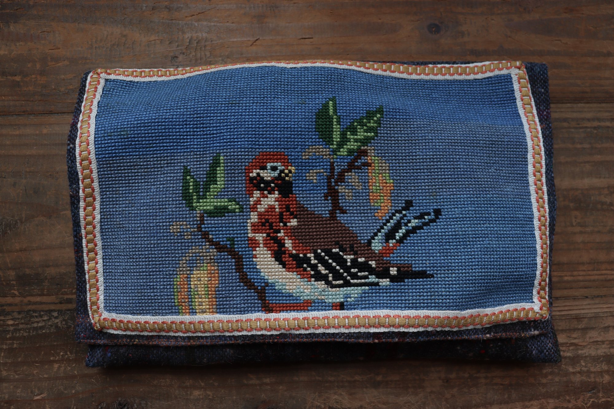 Pochette con uccellino: realizzata con tessuto in lana e ricamo mezzo punto vintage e decorata con passamaneria anni '70. Misure: cm. 21x34