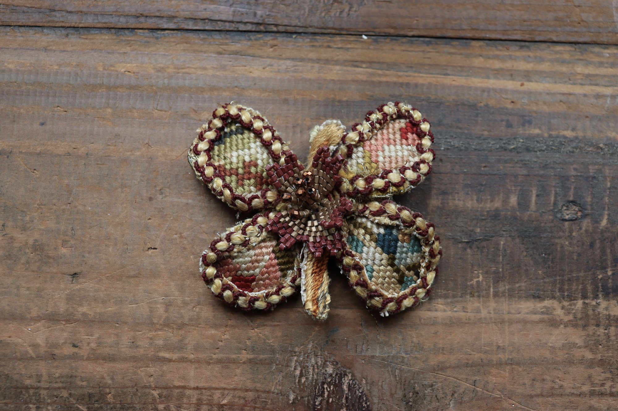 Una wunderkammer i gioielli sentimentali realizzari con antichi ricami a mezzo punto, pizzi ed ornamenti in tessuto vintage.